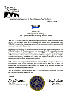 The City of Torrance presented WALSER'S with its inaugural recognition of the Torrance Advantage Award for the "Quality of Life Community Investor" award on March 13, 2008. This was presented for our many years of service to community as a major retail store and extensive recycling efforts.