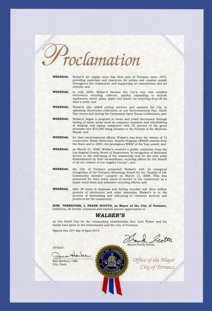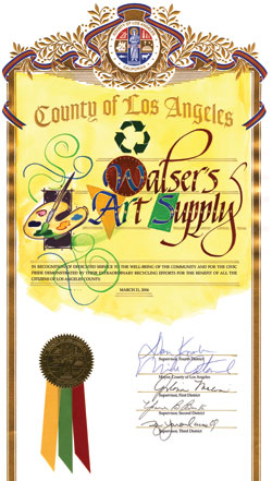 On Earth Day, April 22, 2014, the City of Torrance recognized WALSER'S for over thirty-eight years of service and community involvement as an art supply store and over seven years for its community service as a recycle collection center for residents, business and government agencies.